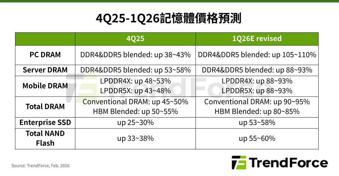 TrendForce 最新記憶體產業調查,2026 年第一季 AI 與資料中心需求持續加劇全球記憶體供需失衡,原廠議價能力有增無減,TrendForce 全面上修第一季 DRAM、NAND Flash 各產品價格季成長幅度,預估整體 conventional DRAM 合約價從 1 月初季增 55%~60%,改為上漲 90%~95%,NAND Flash 合約價從季增 33%~38% 上調至 55%~60%,且不排除再上修可能。